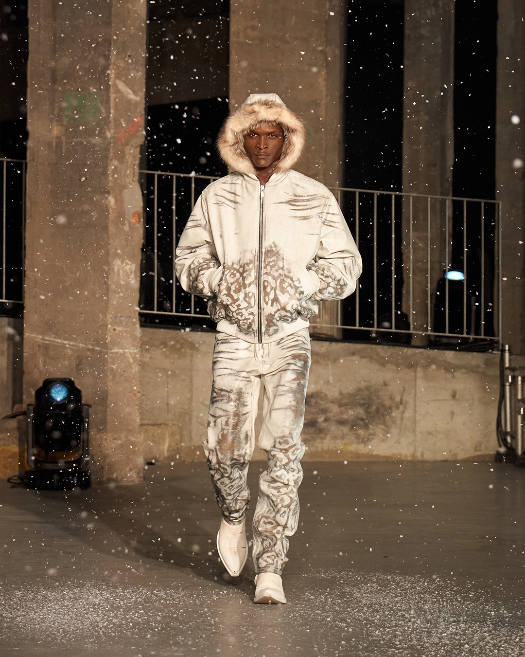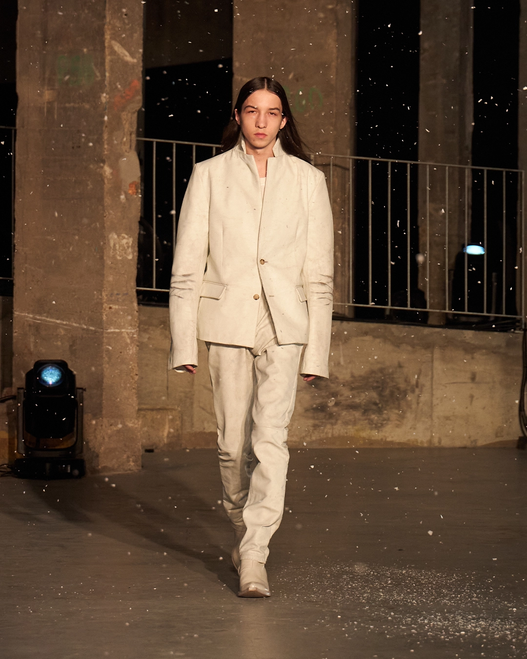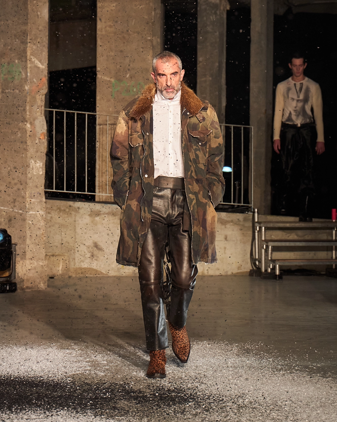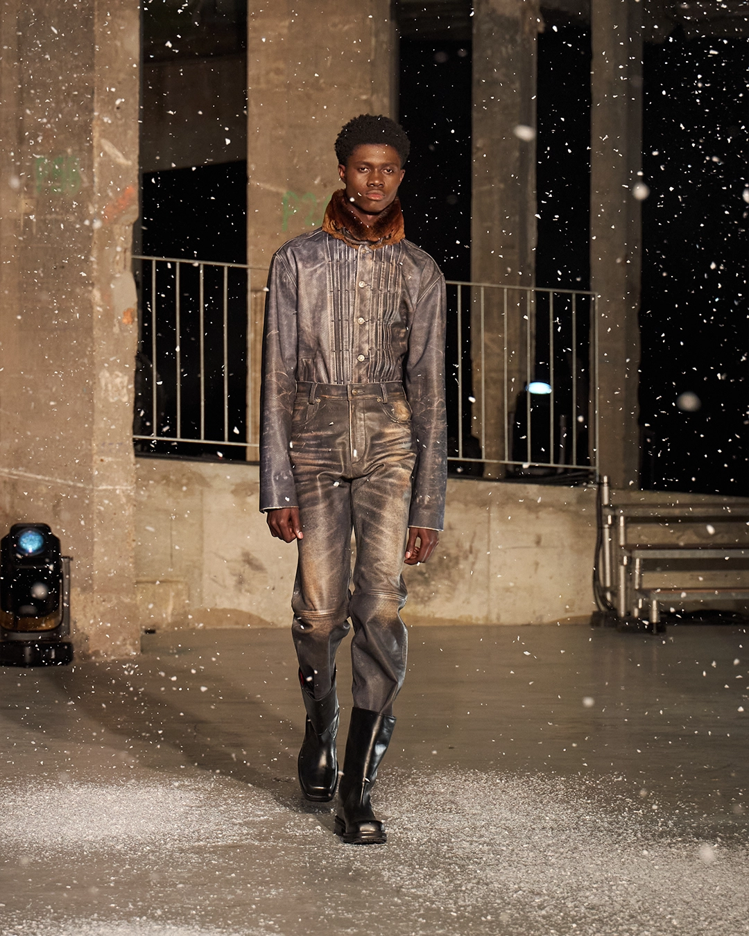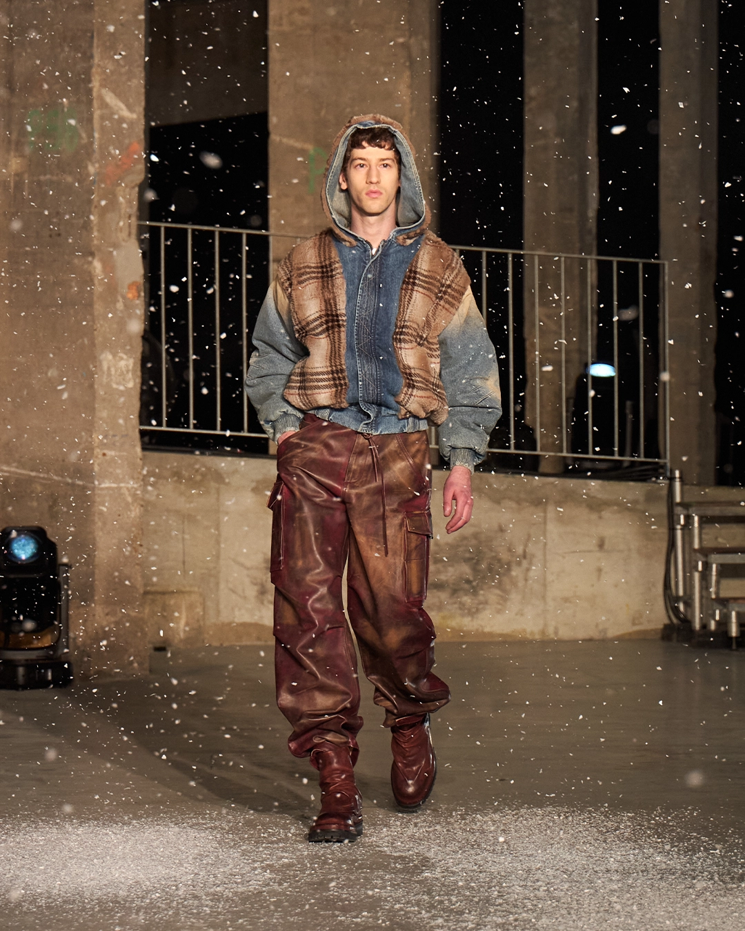 Cette tension entre durabilité et érosion traverse l’ensemble de la collection. 424 y défend une vision du vêtement pensé pour être porté, marqué et transformé par l’usage. La bande-son du défilé prolonge cette approche narrative, passant de rythmes contemporains à des compositions orchestrales, comme une partition en plusieurs actes qui accompagne l’évolution des silhouettes.
