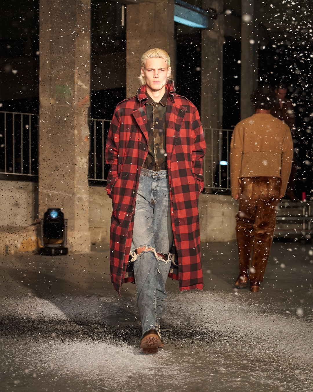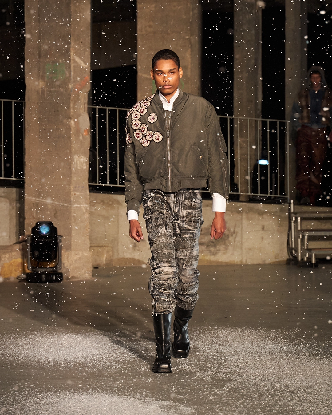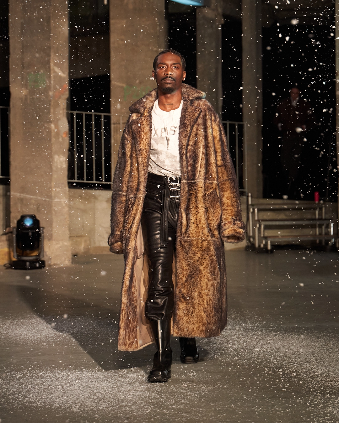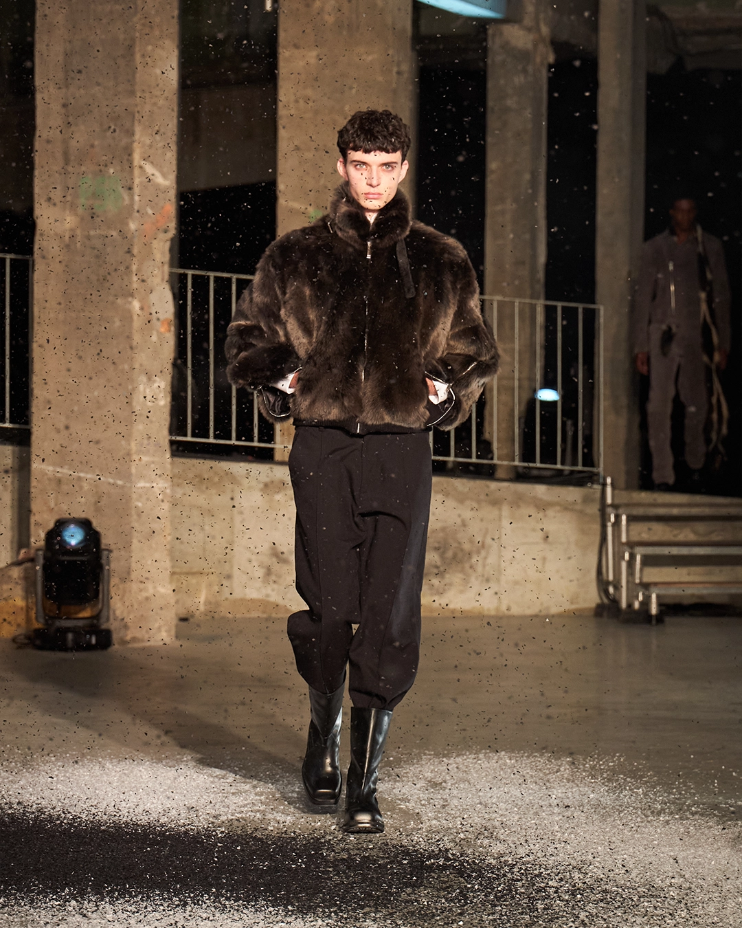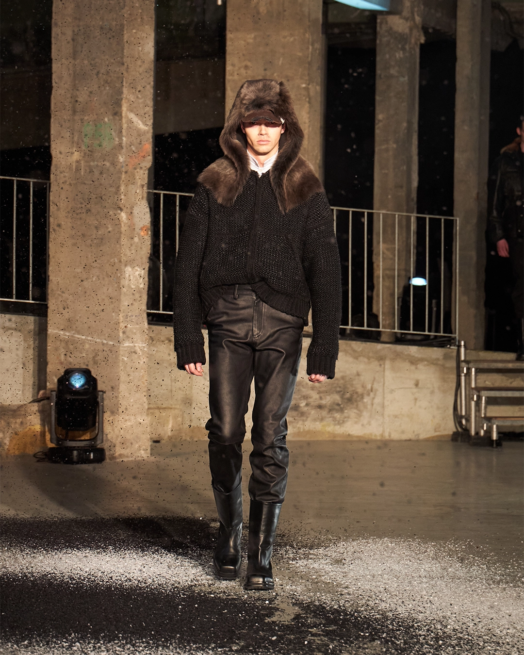 Cette tension entre durabilité et érosion traverse l’ensemble de la collection. 424 y défend une vision du vêtement pensé pour être porté, marqué et transformé par l’usage. La bande-son du défilé prolonge cette approche narrative, passant de rythmes contemporains à des compositions orchestrales, comme une partition en plusieurs actes qui accompagne l’évolution des silhouettes.
