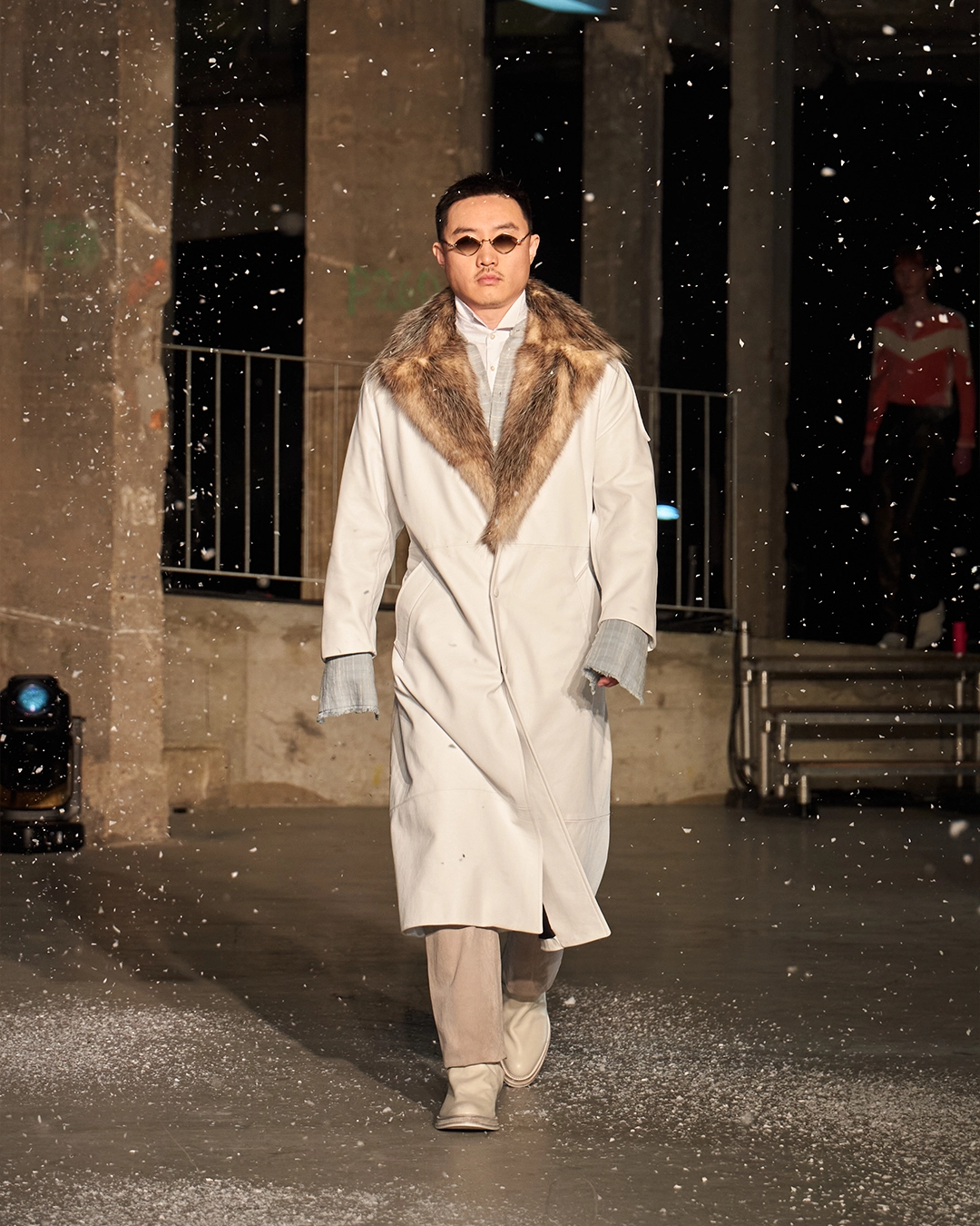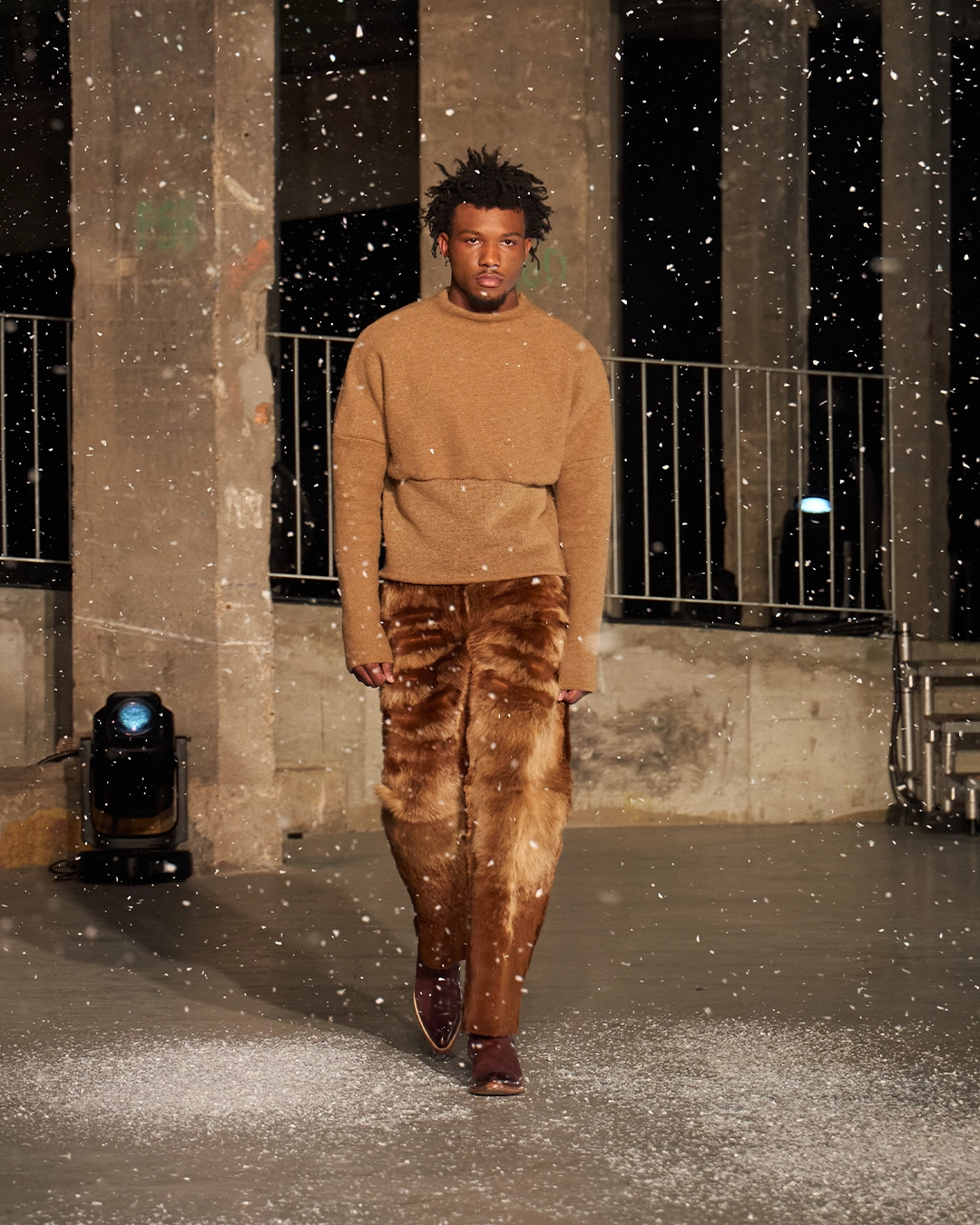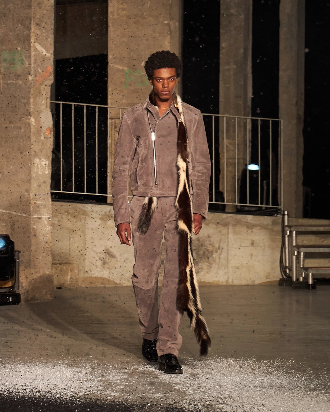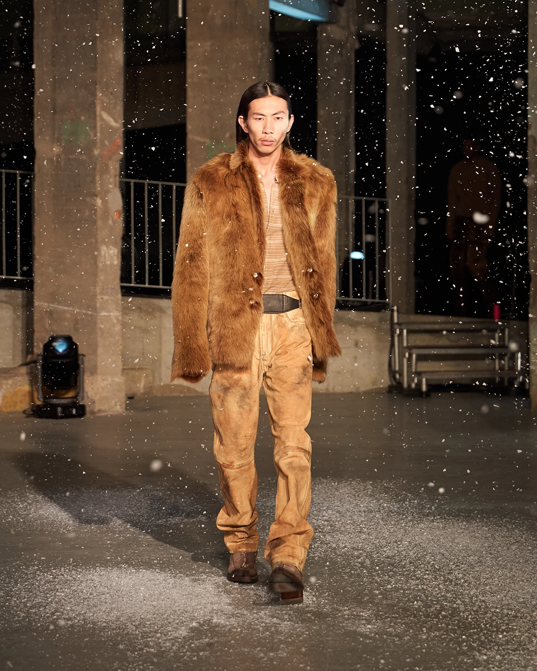 Les vêtements prennent forme à partir de textiles de luxe récupérés et réinterprétés. Denim et fourrure se croisent à travers des pièces expérimentales, tandis que d’anciennes couvertures militaires, âgées de plusieurs décennies, sont transformées en silhouettes tailleur. Les cuirs et fourrures initialement écartés pour leurs défauts deviennent ici des éléments clés de la collection, retravaillés par des procédés longs et visibles : usure volontaire, teinture, tissage ou vieillissement. Chaque pièce porte ainsi la trace du temps et de la main, revendiquant l’imperfection comme un choix esthétique assumé.