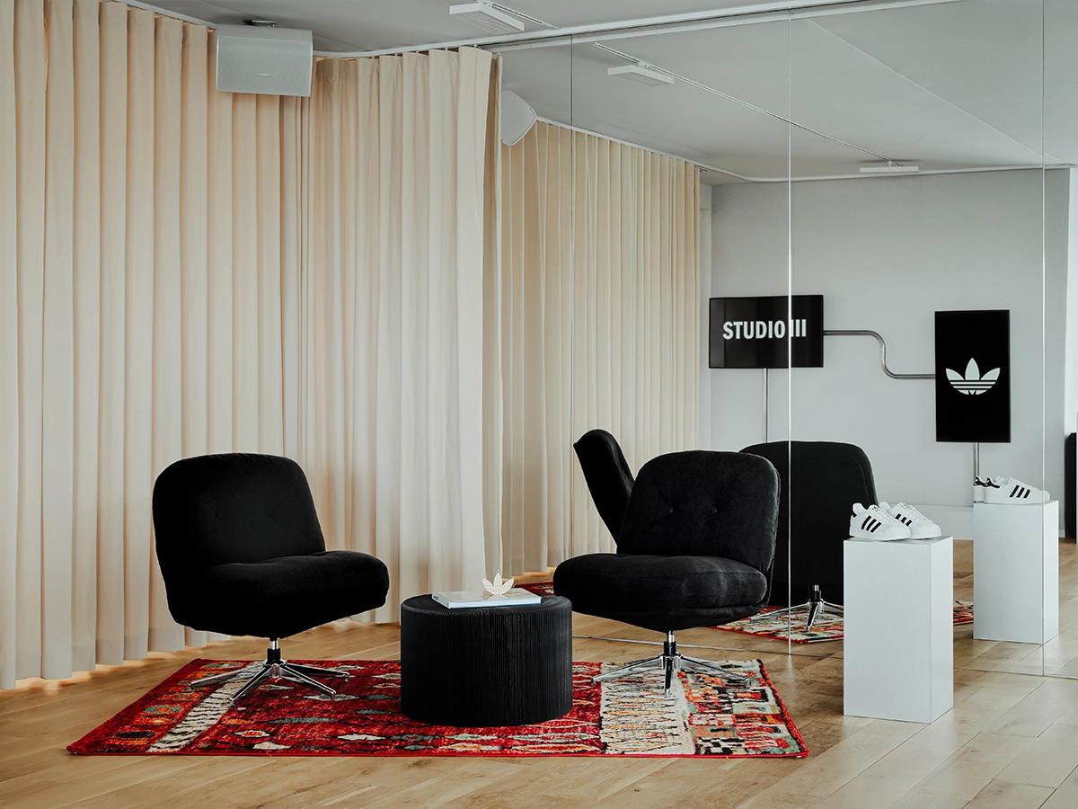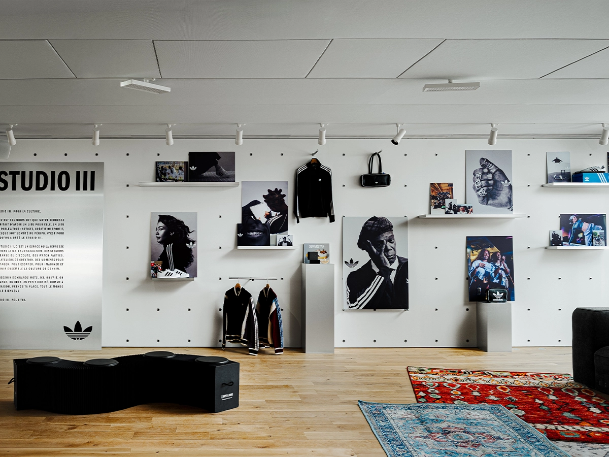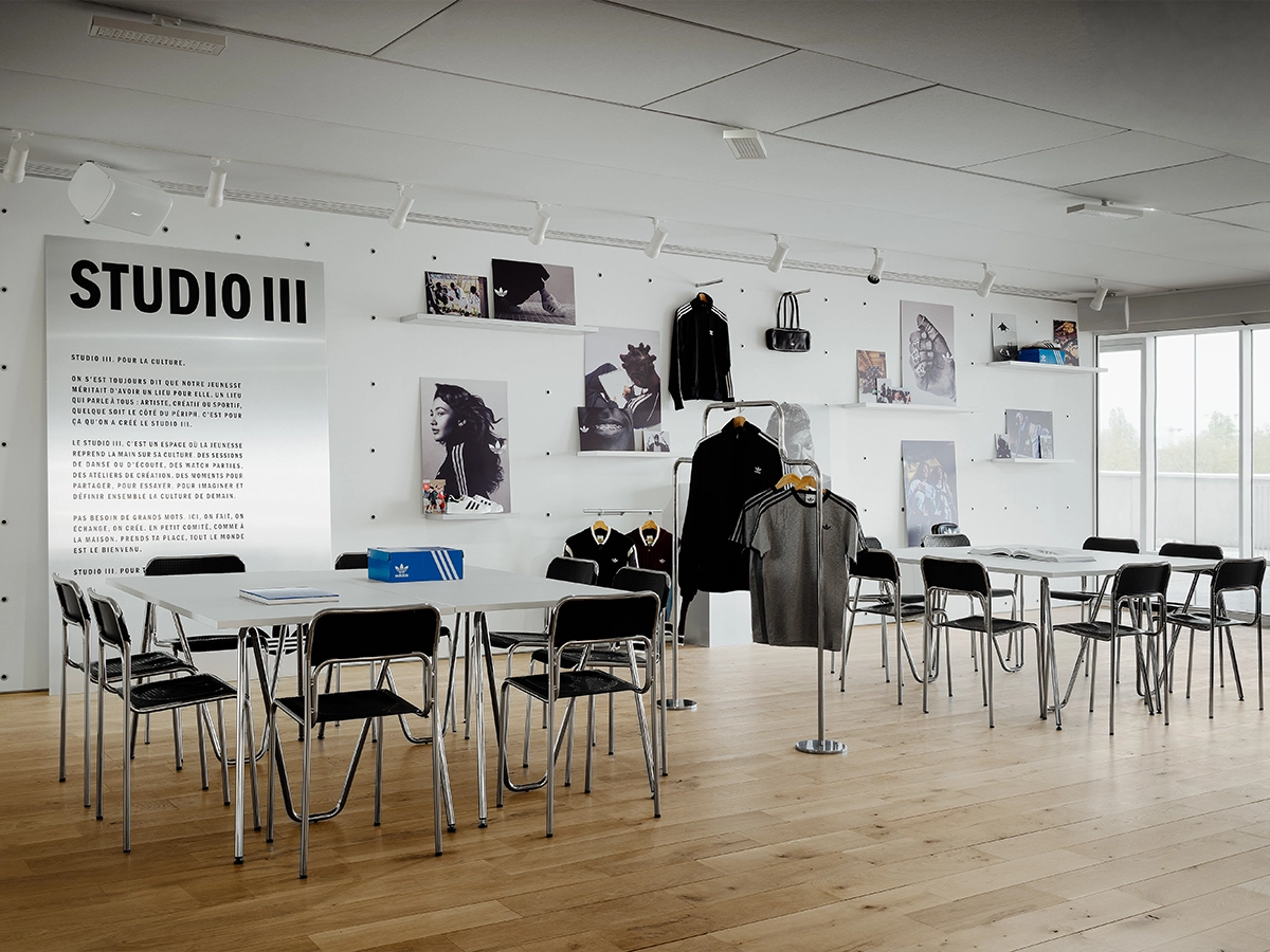 Sur 140 m², accessibles cinq jours sur sept, le Studio III se divise en deux espaces complémentaires. Le premier est orienté vers les acteurs associatifs locaux, un tiers-lieu pensé pour le travail collaboratif, les ateliers de formation et le soutien scolaire. Le second est un espace culturel et artistique ouvert aux clients, aux collectifs locaux et aux partenaires créatifs de la marque, accessible via adiClub, le programme de fidélité adidas.