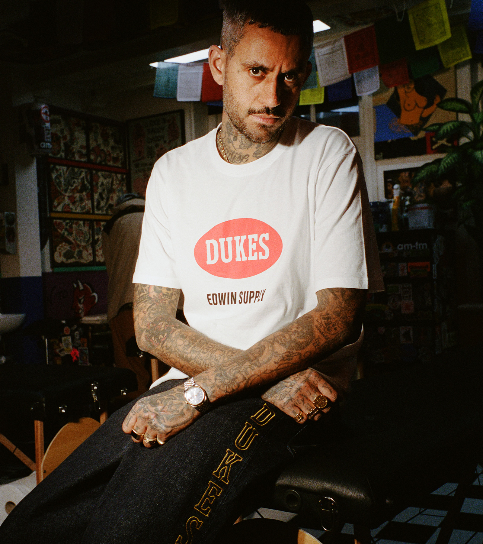 Pour cette édition limitée, le label japonais Edwin repense deux pièces phares (le pantalon Made in Japan Wide Pant et les T-shirts classiques) en collaboration avec Dukes Cupboard, figure incontournable du vintage et du sportswear d’archives. Né en 2012 sur le marché de Berwick Street, le duo fondé par Ned Membery et Milo Harley s’est imposé au fil des années comme une référence pour les chasseurs de pièces rares. Leur approche consiste à créer des projets qui dépassent la simple logique commerciale, transformant chaque collaboration en intervention culturelle soigneusement pensée.