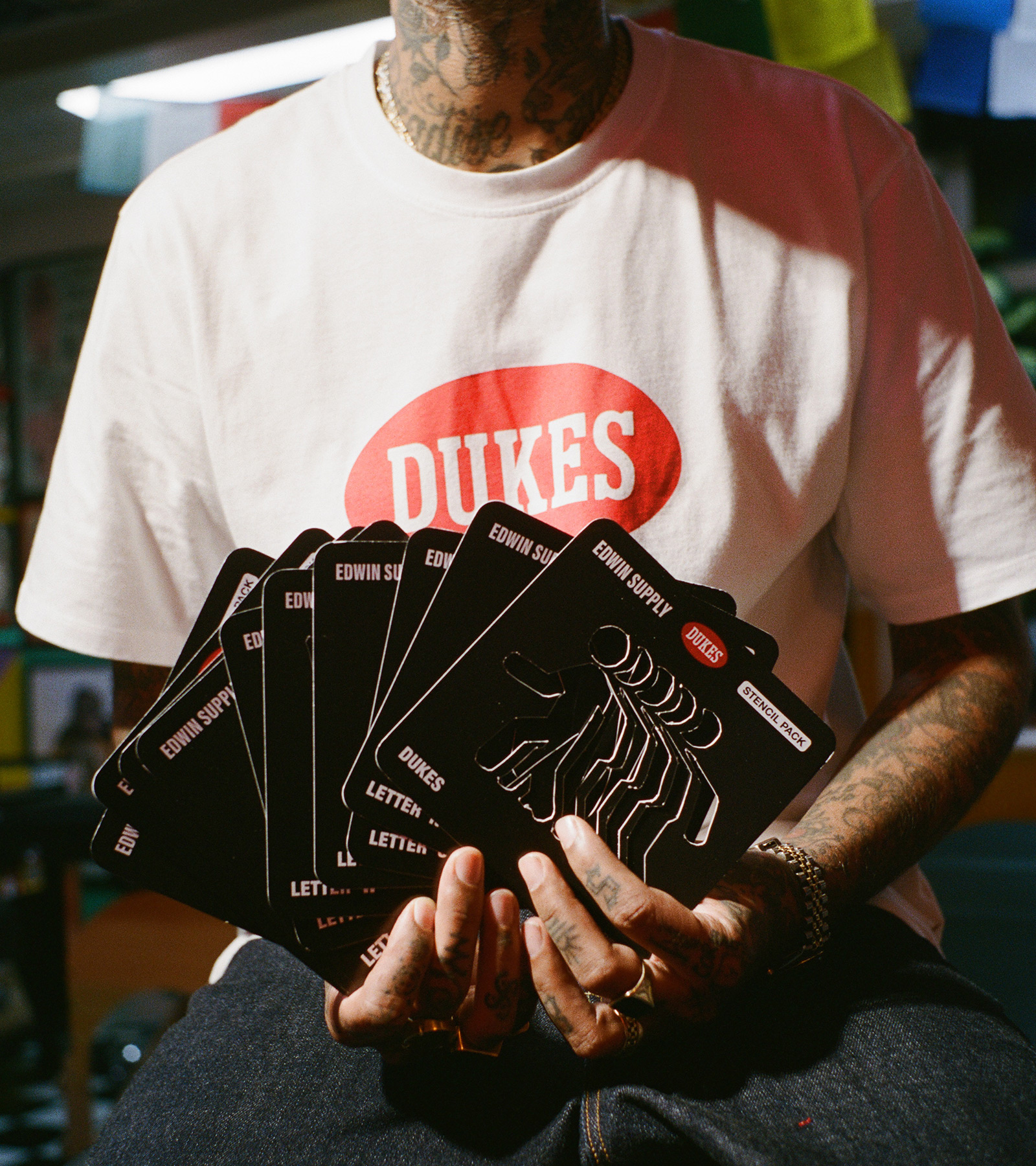 Avec EDWIN, l’inspiration vient naturellement du graffiti. Les deux marques plongent dans l’imaginaire du spray paint, notamment à travers l’héritage visuel de Krylon, référence absolue des années 80 et 90. Le Wide Pant est réinterprété en denim 14oz red listed recycled selvedge, un matériau robuste et conscient, agrémenté d’un embroidery exclusif imaginé par Dukes. Le pantalon est livré avec un pack de pochoirs conçu pour permettre aux clients de customiser leur denim selon leurs envies, renouant avec l’esprit DIY qui a façonné l’esthétique street des premières générations graffeurs.