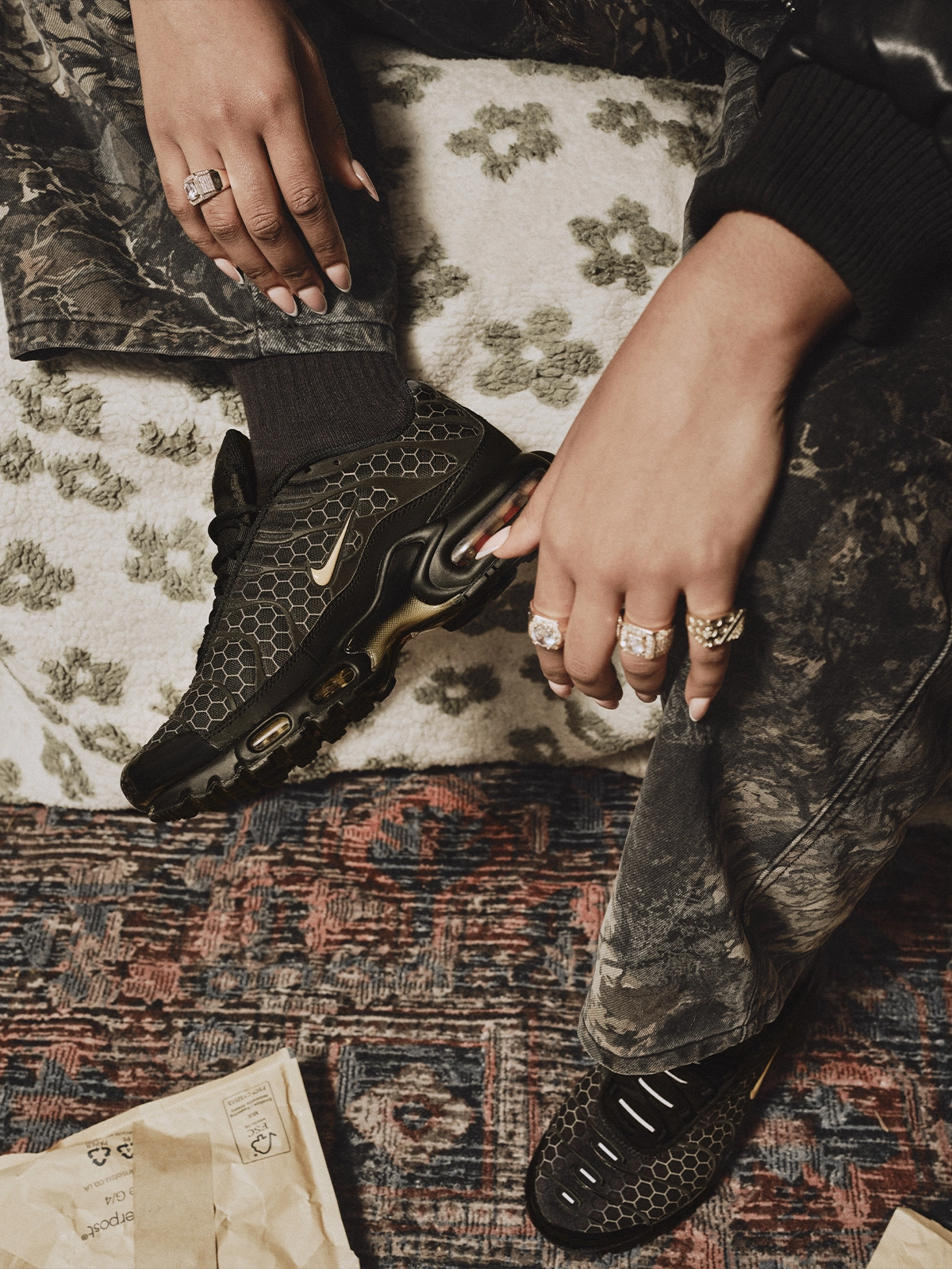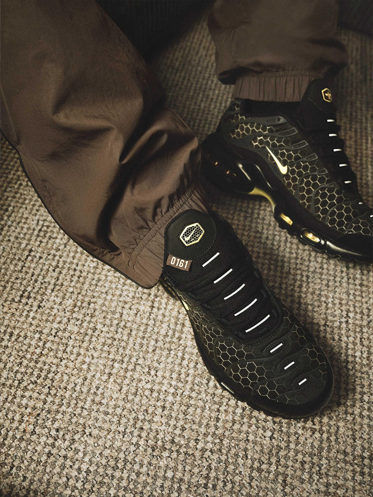 Le design de cette édition Manchester joue sur un équilibre entre discrétion et symbolique forte. La palette de couleurs associe un noir dominant à des nuances de crème et de marron. L’ensemble se veut sobre, presque minimaliste, mais c’est dans les détails que la paire prend tout son sens. L’abeille de Manchester, symbole historique de la ville qui incarne résilience et solidarité, est intégrée à plusieurs endroits du modèle. Des motifs de ruches parcourent discrètement la tige, la semelle et l’arrière de la chaussure. L’insecte lui-même est cousu à l’intérieur de la languette, comme un signe de reconnaissance réservé aux initiés.