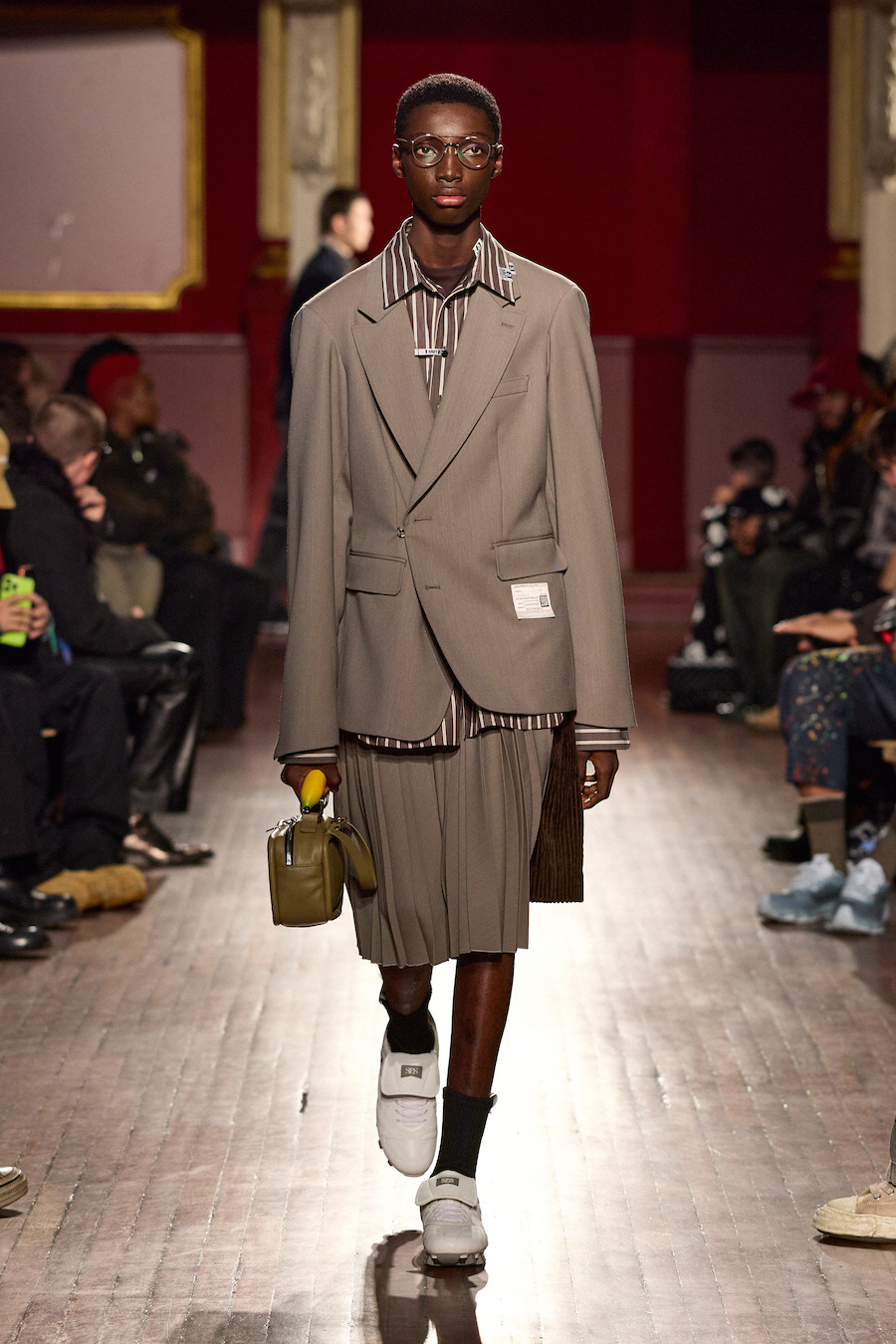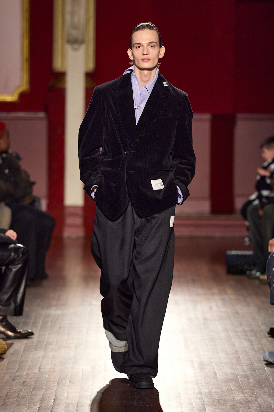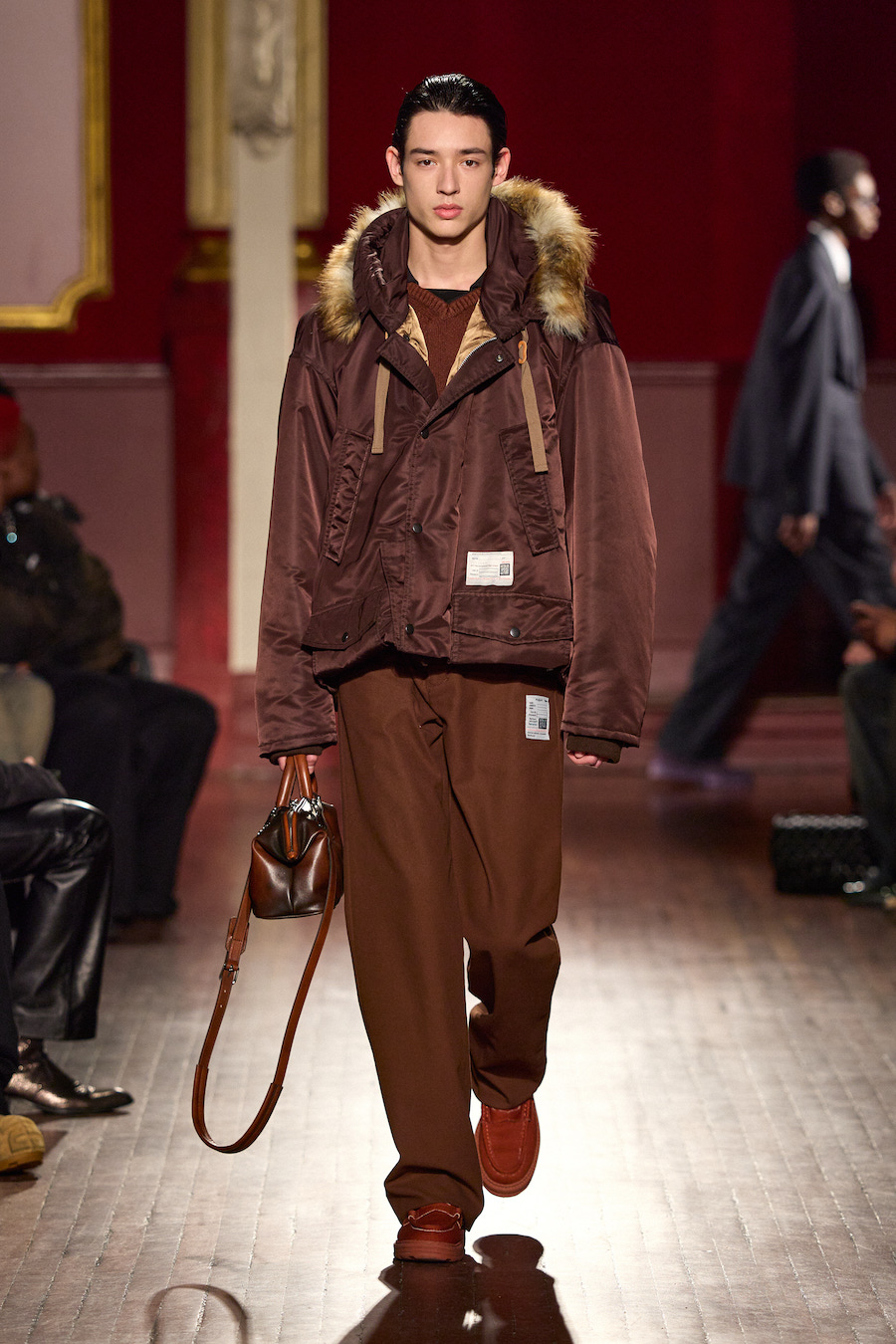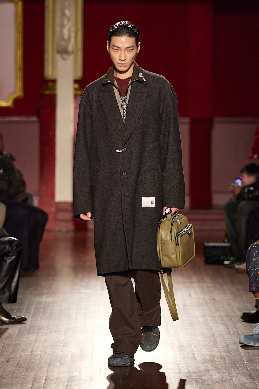 Le vestiaire masculin et féminin, pensé conjointement par Mihara Yasuhiro et Yukari Ota, s’inscrit dans cette continuité. Les vêtements évoquent le quotidien, mais un quotidien transformé, comme filtré par la mémoire. Les matières, les finitions et les associations inattendues participent à cette impression d’un monde qui se dissout lentement sans jamais disparaître complètement. Chaque tenue semble porter la trace d’un vécu, d’un moment suspendu entre passé et présent.