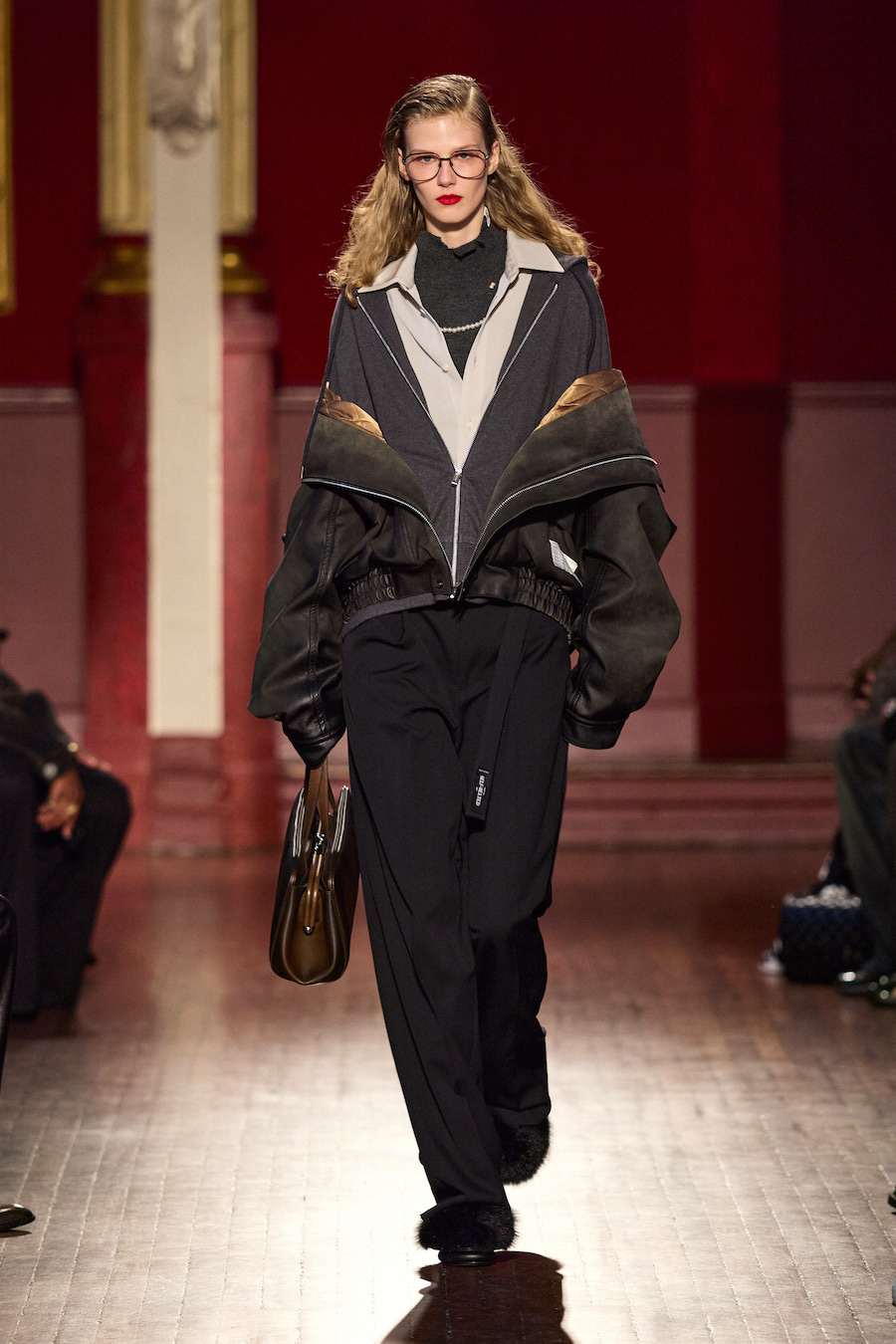 Cette sensation de flottement se traduit directement dans les silhouettes. La collection est traversée par une idée de désalignement volontaire, de dissonance douce, où les pièces semblent légèrement déplacées, comme perçues à travers une vision altérée. Les proportions jouent avec l’équilibre, les volumes se décalent, et les superpositions brouillent la lecture immédiate du vêtement. Mihara Yasuhiro ne cherche pas la rupture spectaculaire, mais une tension subtile entre familiarité et étrangeté, reflet d’un présent étiré, presque immobile.