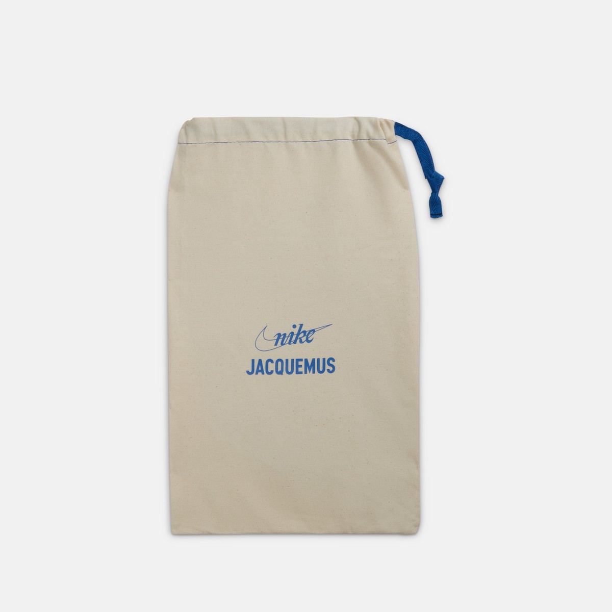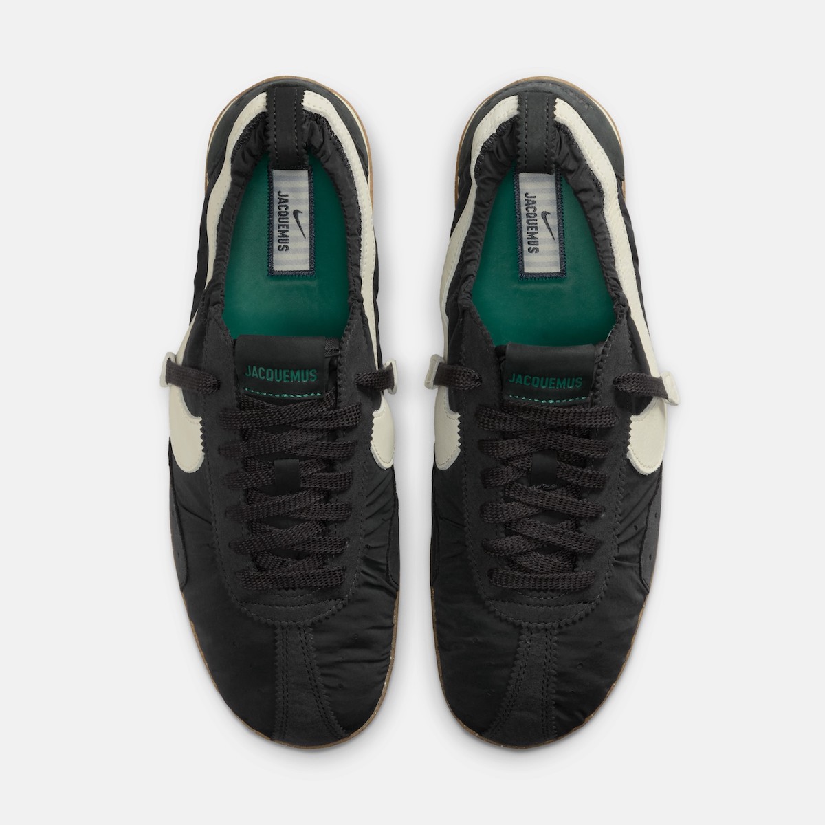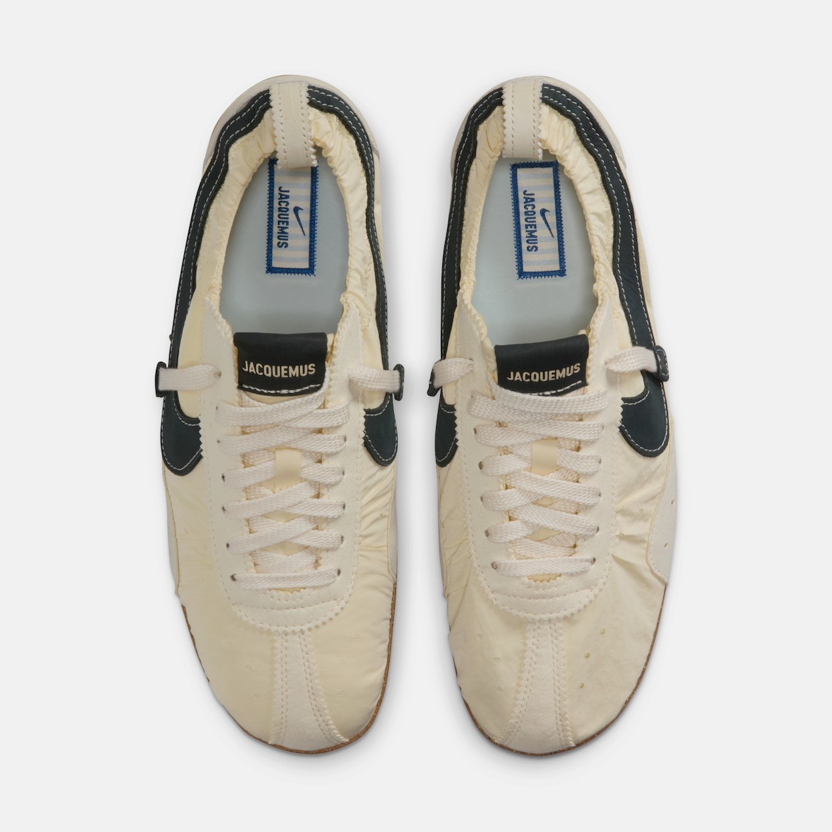 La nouvelle Moon Shoe associe une tige en nylon froncé et une semelle extérieure Nike Regrind, construite à partir de matériaux recyclés, à une silhouette basse et profilée évoquant les lignes d’un ballet moderne. Des détails en cuir, un Swoosh affirmé et un contrefort de talon renforcent l’identité du modèle, tandis que les logos Jacquemus ponctuent la languette, le talon et la semelle intérieure. Le packaging exclusif, co-brandé, rend hommage aux débuts de Nike sous le nom de Blue Ribbon Sports.