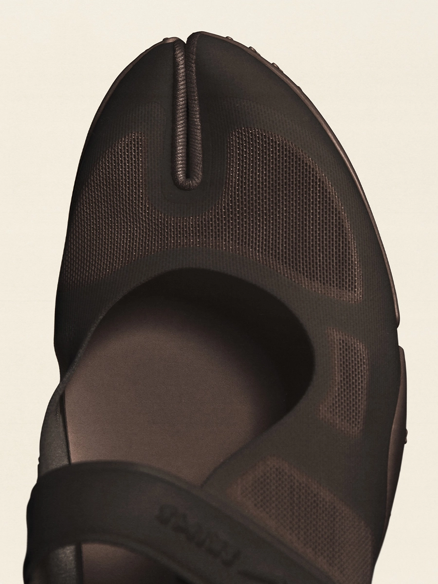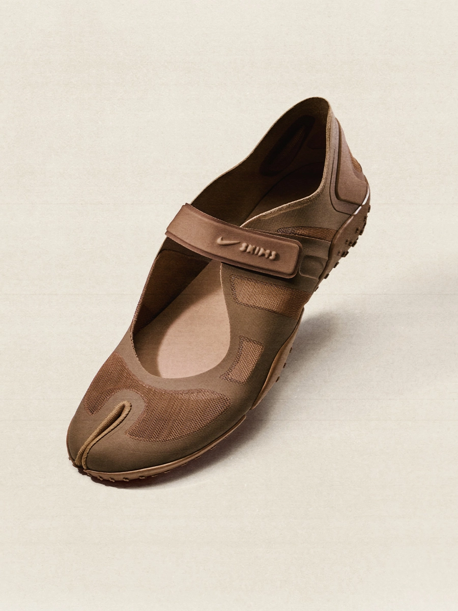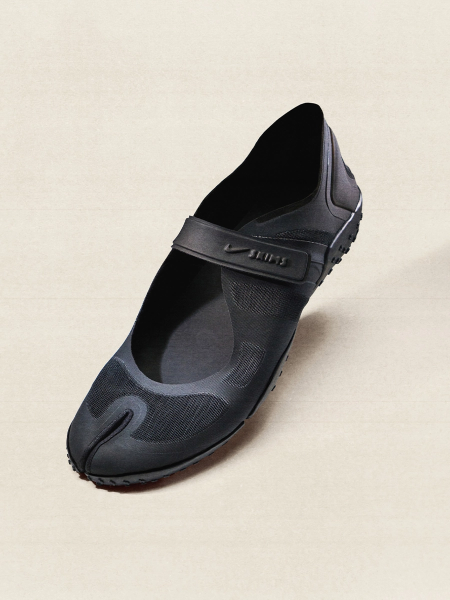 Pour inaugurer cette nouvelle catégorie, NikeSKIMS s’appuie sur un modèle culte de l’histoire Nike. La Air Rift, lancée en 1996, s’est distinguée dès ses débuts par son bout fendu inspiré du « tabi », pensé pour favoriser un mouvement plus naturel du pied. À l’époque, cette conception s’inspirait directement des coureurs de fond kenyans et de leur pratique de la course pieds nus. Presque trente ans plus tard, cette silhouette revient sous une forme repensée, épurée et adaptée aux usages actuels, entre sport et quotidien.