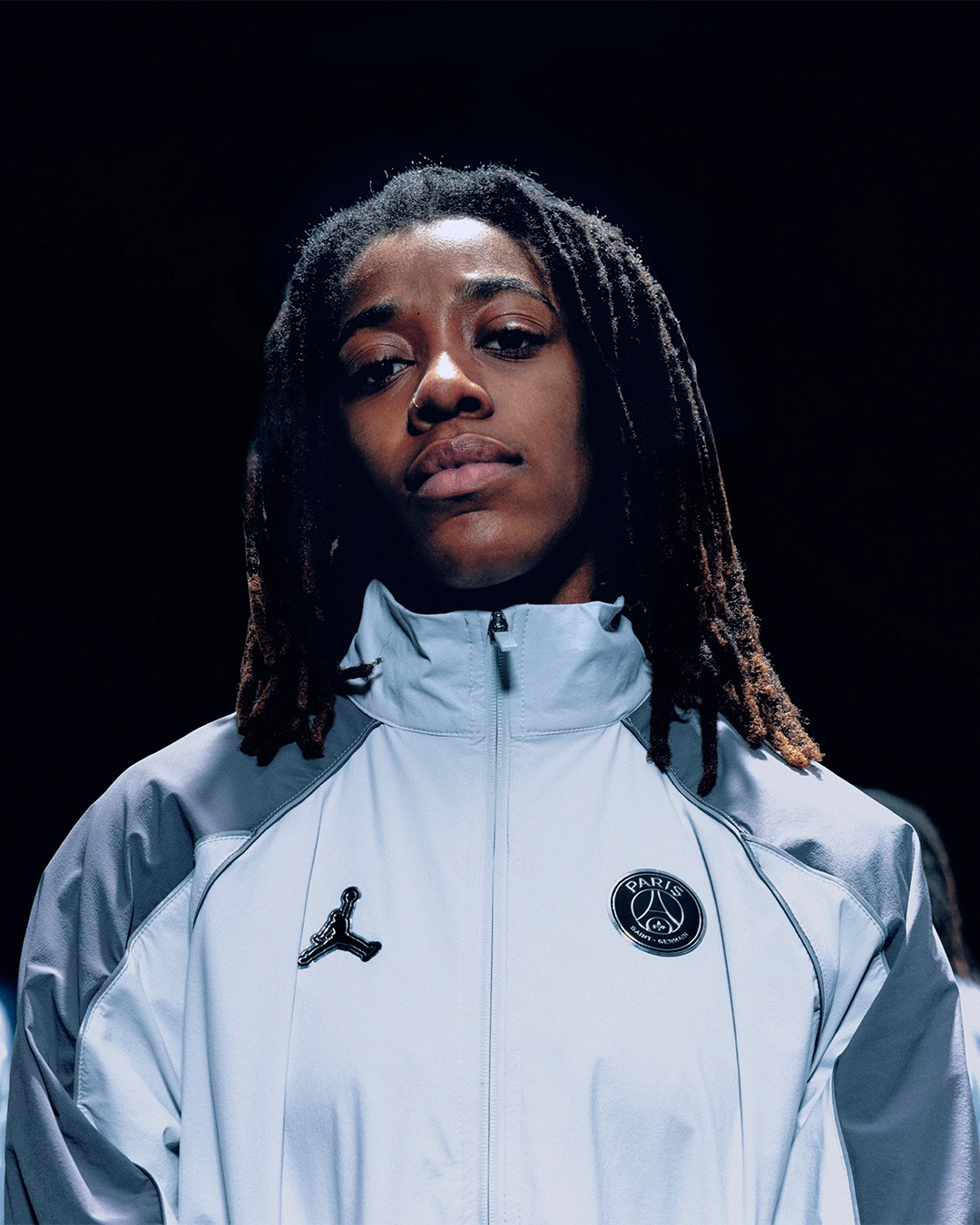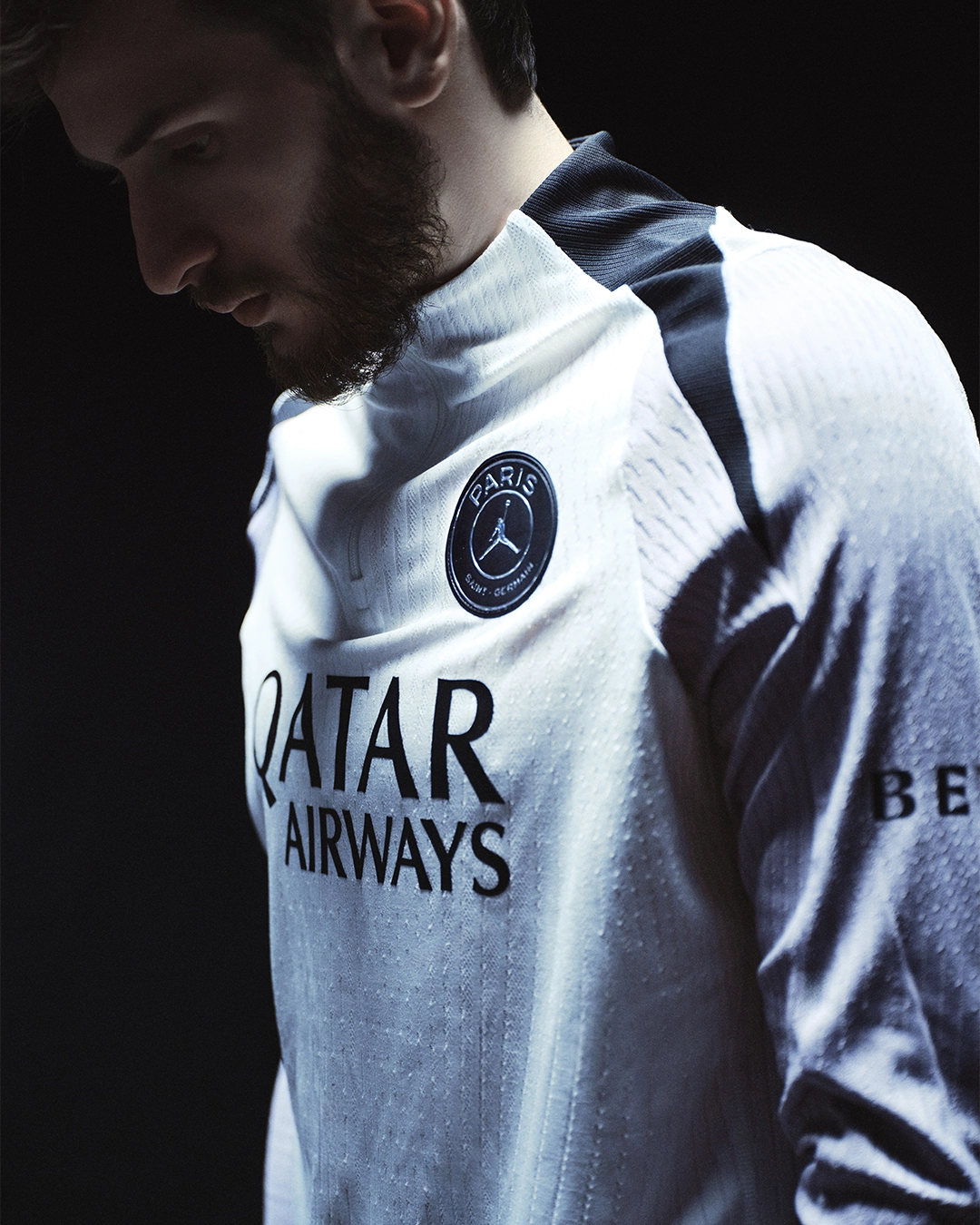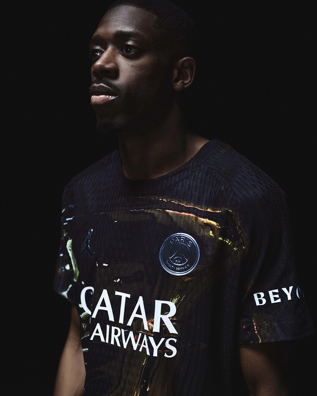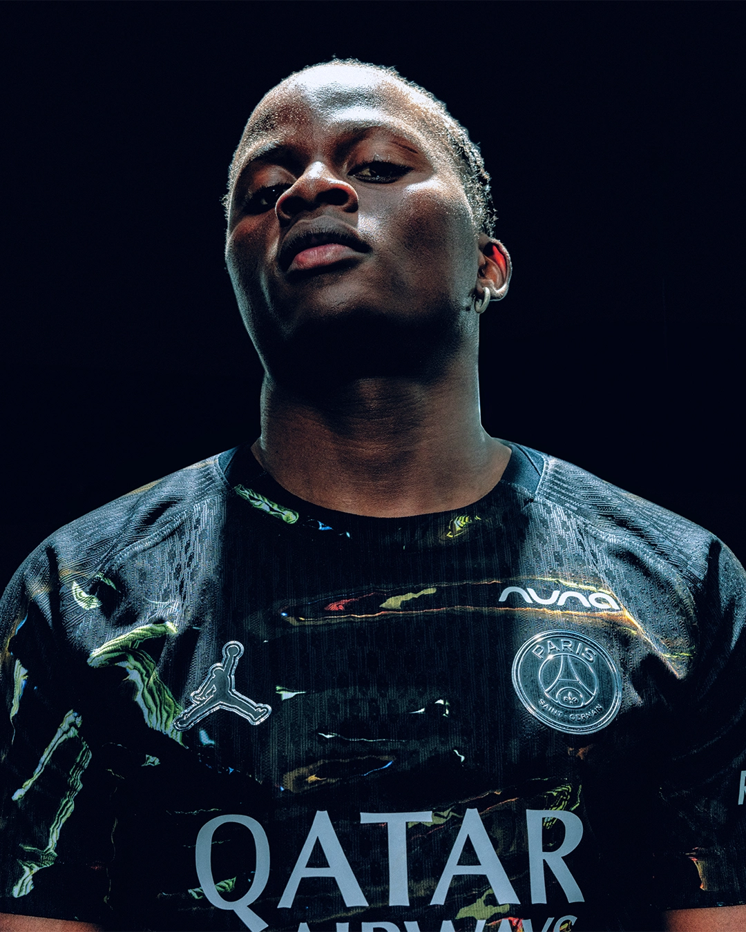 L’inspiration visuelle provient directement des reflets lumineux du Trocadéro, l’un des lieux les plus emblématiques de la capitale. Sur l’ensemble du maillot, un imprimé graphique mêle chrome et noir pour reproduire ces jeux de lumière qui transforment le paysage urbain une fois la nuit installée. L’esthétique se situe à la frontière entre design contemporain et performance sportive, une direction artistique désormais familière dans les collaborations entre le club parisien et la marque au Jumpman.