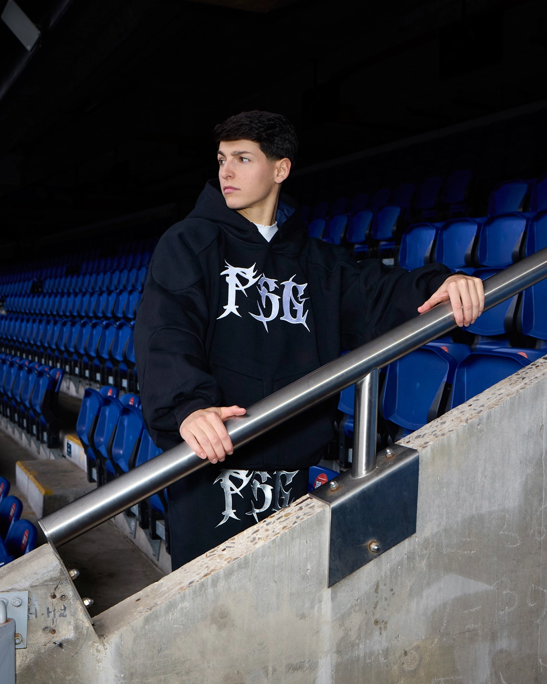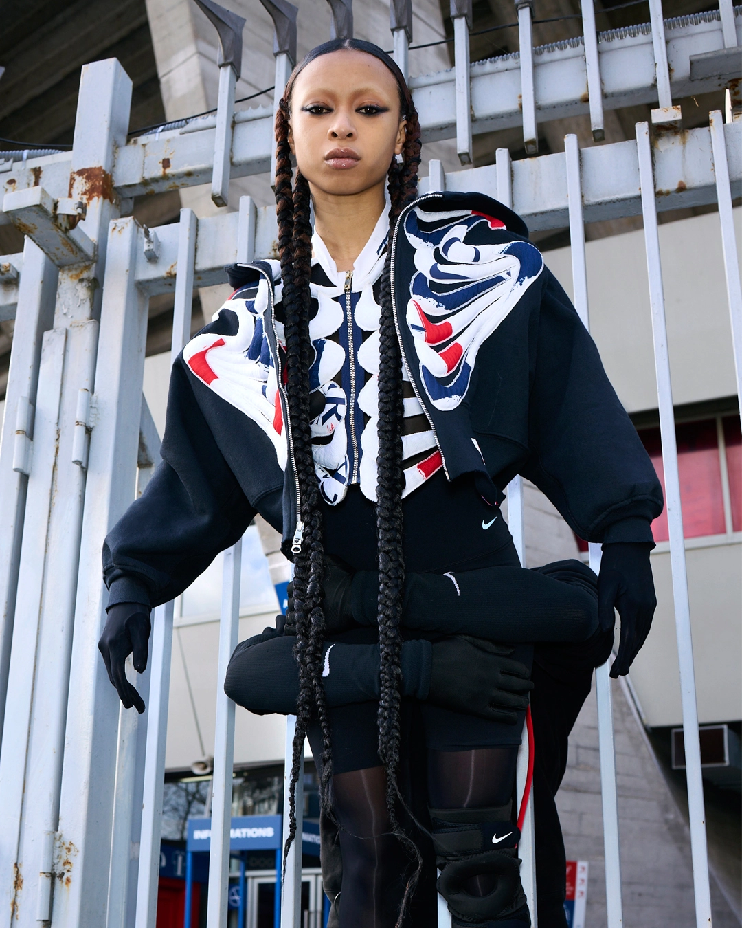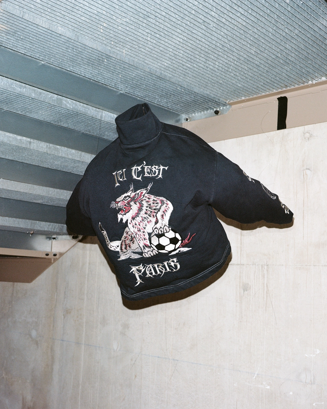 La designer a travaillé à partir d’anciens maillots et de pièces Nike et PSG existantes, qu’elle a déconstruites puis reconstruites pour créer des silhouettes contemporaines. Chaque vêtement conserve une part d’histoire tout en adoptant une nouvelle identité, plus sombre, presque romantique. Les coupes retravaillées, les superpositions et les assemblages visibles traduisent un processus rigoureux où l’upcycling devient un véritable parti pris esthétique.