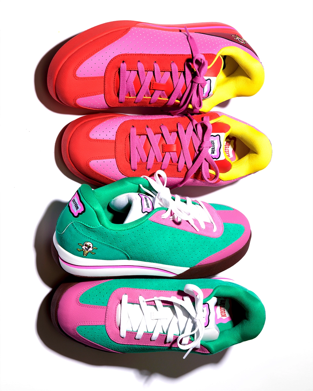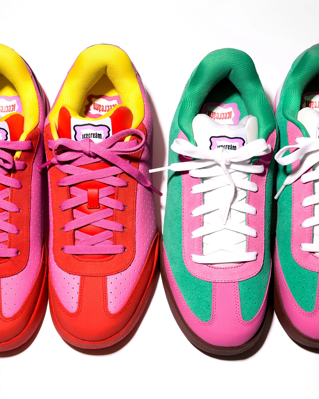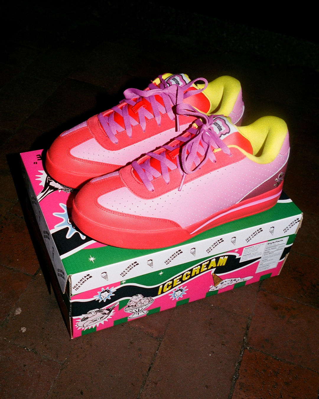 Le coloris Watermelon, déjà présenté lors du ComplexCon, revient ici accompagné d’un nouveau venu : le Pink Lemonade. Deux propositions chromatiques (rose/rouge et vert/rose) qui jouent avec les codes du streetwear actuel sans trahir l’identité d’origine. La construction reste fidèle à l’esprit de la silhouette : tige en cuir avec panneaux perforés, œillet en suède, embout en caoutchouc texturé, semelle intermédiaire en EVA injecté avec rainures peintes, et une semelle extérieure adaptée à la pratique du skate. Le branding Icecream est présent sur la languette, le talon et la semelle intérieure, avec le logo Bones & Cones brodé sur le talon latéral. La paire est livrée dans une boîte Icecream personnalisée, deux options de lacets incluses.