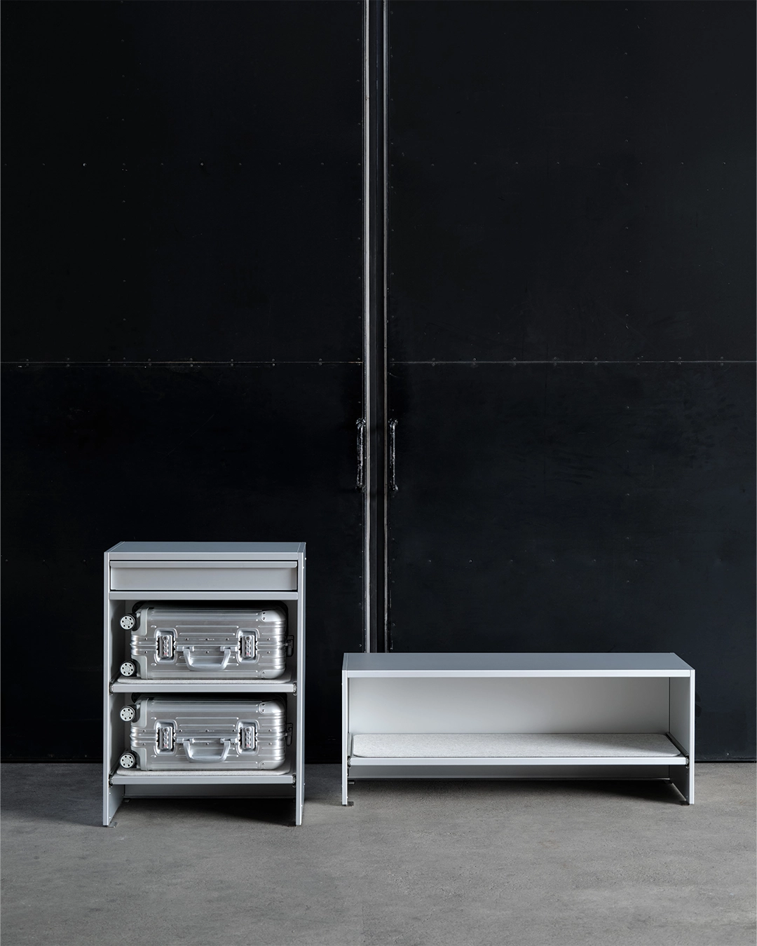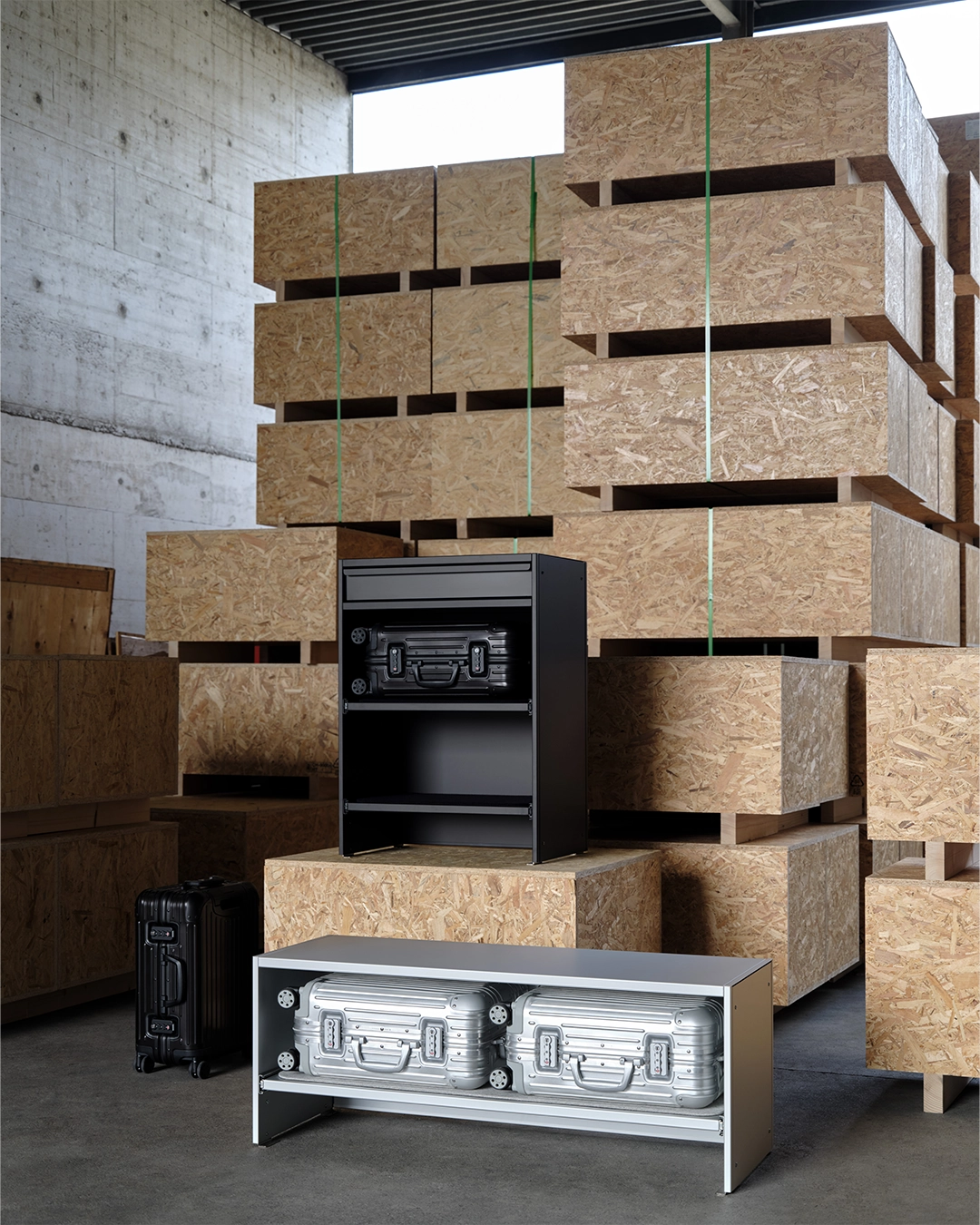Présentée à l’occasion de la Milan Design Week 2026, cette collaboration en édition limitée donne naissance à deux pièces en aluminium anodisé, déclinées en noir et en argent : un banc et un module de rangement. Conçus spécifiquement pour accueillir les valises cabine de la marque allemande, ces objets prolongent l’esthétique iconique de RIMOWA tout en l’inscrivant dans un usage quotidien, à la maison.